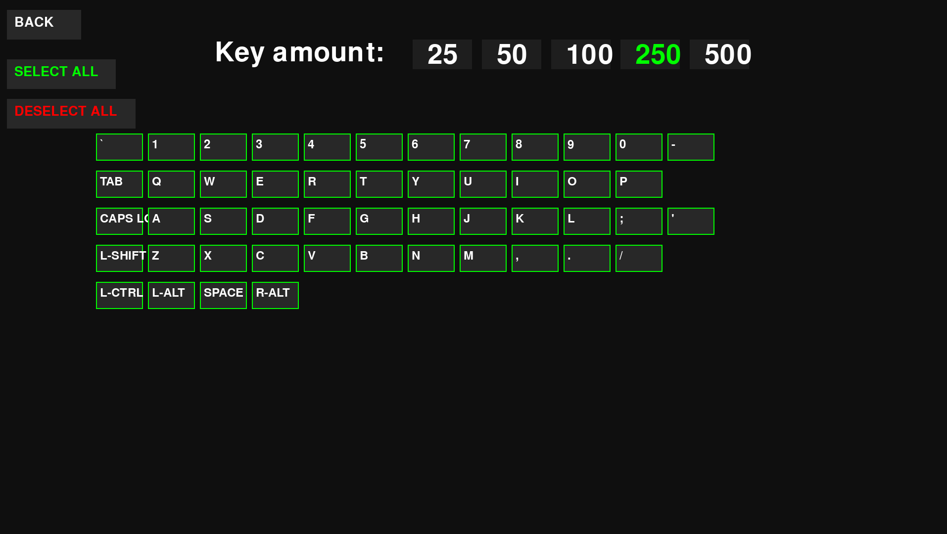 The app features a clean UI, small file size, and full customization of which keys you want to practice. The goal is simple self-improvement of keyboard and keybind muscle memory.